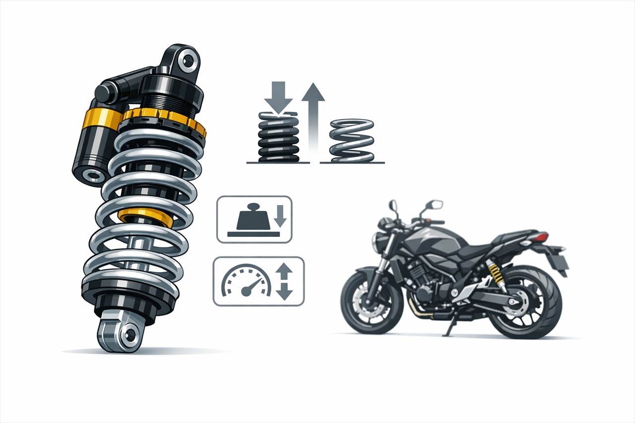 - 反発力の増大(リバウンドエネルギー): [プリロードをかける=バネをあらかじめ縮めてエネルギーを溜めること]です。車体を起こす際、この蓄えられた反発力が「戻ろうとする力」を助け、動作を軽快にします。この「戻りの速さ」が、ライダーには「ヒラヒラ動く」という軽快な体感として伝わります。